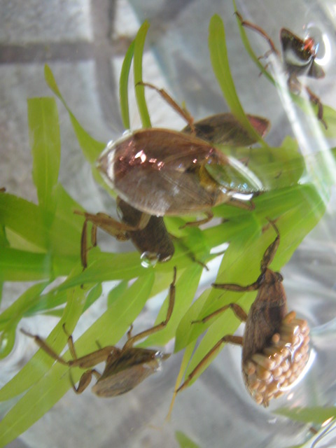 メスが産んだ卵をオスが背中にしょって泳ぎながら育てる「コオイムシ」水生昆虫です。