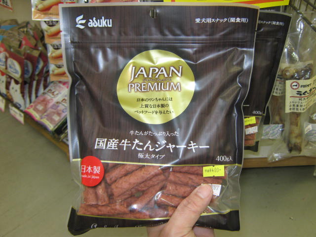 うっ!ウマそうだ・・・! 「国産 牛タンジャーキー 極太タイプ」 特価!! ¥480!!レジ前で販売中!