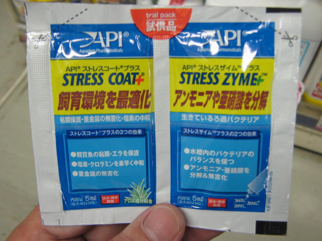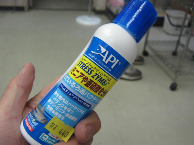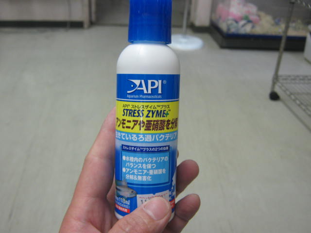 それともう1つ!少し前に飼育水の「汚れ」を測定する試験紙と一緒にセット販売したバクテリア「ストレスザイムプラス」!こちらも柏店の定番扱いとなりました! バクテリアも既に柏店には色々あるのにこれを取り扱うことにしたのは、やはりバクテリアとしての質が良いからです。アンモニアや亜硝酸を分解する仕事が早いようです。 この118ml入りのボトルで¥880。
