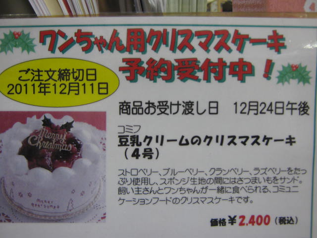 4号サイズの「豆乳クリーム」クリスマスケーキです。何がすごいって、このケーキは「ワンちゃん専用!!」というより、ワンちゃんと飼い主様が一緒に