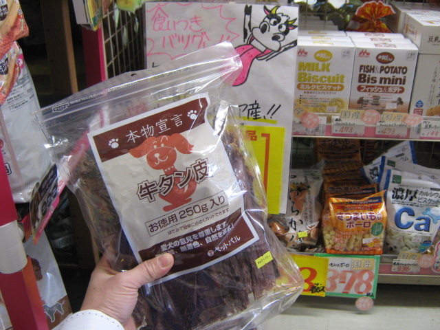 以前この商品の試供品をお配りしたら、それ以降リピーター多数!! よく食べるし、しばらくワンちゃんがくちゃくちゃ噛んでいられるから人気です! 「牛タン皮 徳用」 特価!! ¥598!!ちなみに後ろのPOPの舌を出してる牛の絵、私が描いたんです