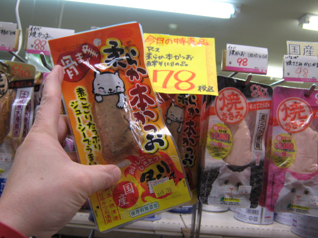 やわら~くって、ジューシー! 「柔らか本かつお」 特価!! ¥78!! そのまんま与えちゃってもいいし、ドライのキャットフードの上にほぐしてトッピングしてあげてもいいね!