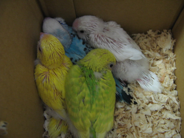 セキセイインコのヒナも4羽連れて来ました! キレイな「スパングル」も1羽います!