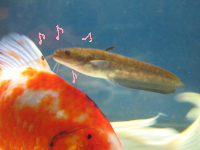 大きな金魚やコイに混じって楽しそうです。本来ナマズは肉食魚なので、金魚と一緒には飼えないのですが、まだこのナマズは10cmちょっとの幼魚で、一緒に泳いでいるコイや金魚は2~30cmあるので、全然大丈夫なのです。