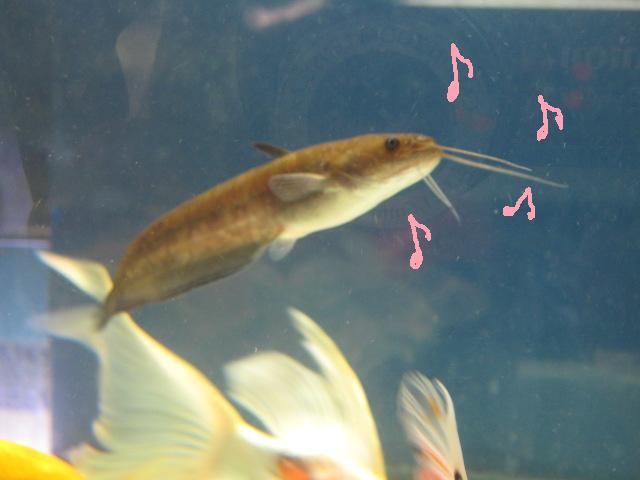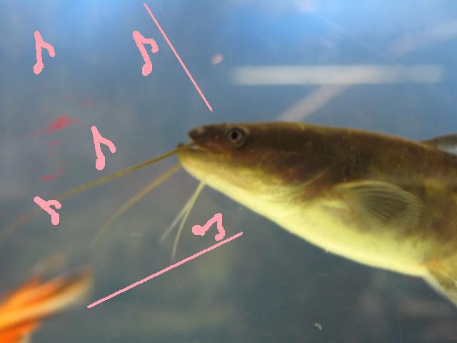120cm水槽のナマズさんかわいいでしょ?いつも気持ち良さそうに泳いでいて、お客様がみんなお帰りになられて、閉店して誰もいない時間、120cm水槽の前でそぉ~っと息をひそめて耳を澄ますと、あのナマズさんの鼻歌が聞こえるんですよ!(嘘)