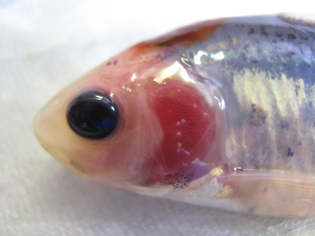 いいえ、違います。これはね、「俺は男だぞ!」っていうシルシです。『追い星』と言って、オスの金魚は発情するとエラブタとかにこういった白いプツプツが出てくるのです。金魚を飼ってらっしゃるお客様、ちょっとお家の金魚さんのエラブタを見てみましょう!