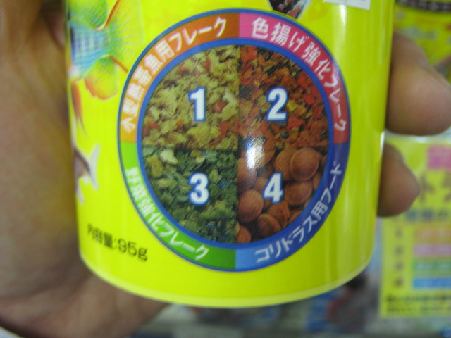 1 小型熱帯魚用フレーク 2 色揚げ強化フレーク 3 野菜強化フレーク 4コリドラス用フード