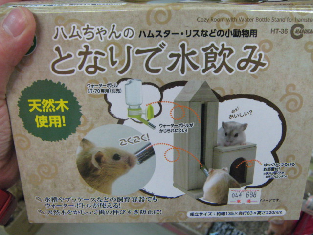 最後はこちら!画像では分かりづらいかもしれませんが、三角お屋根の塔みたいになってるところに、ウォーターボトルが入れられます!それで何が良いのか?と言いますと、水槽やプラケースでハムちゃんを飼おうとした場合、一番困るのがウォーターボトルが取り付けにくいというところ。 この商品があれば、その問題は一瞬で解決