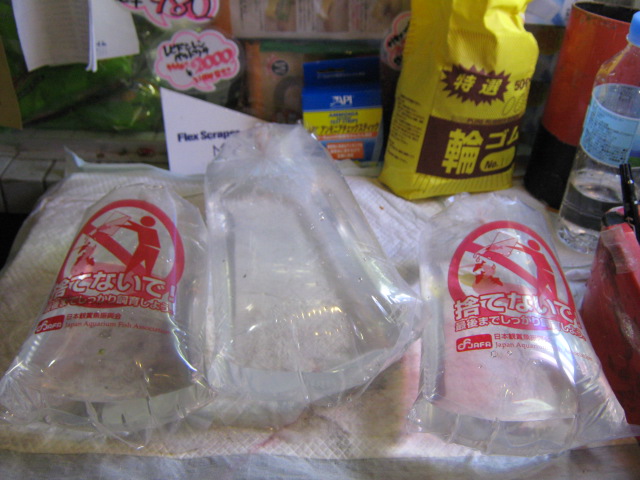 では、真ん中の無地の袋は何か?と言うと、それが例のサビトマトガエルのおたまじゃくし・・・。問屋さんから届いたやつを、私がそのカウンターに置いておいたのです。