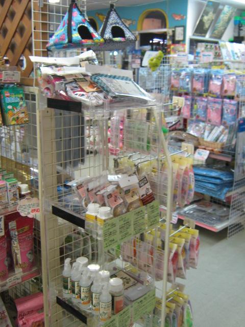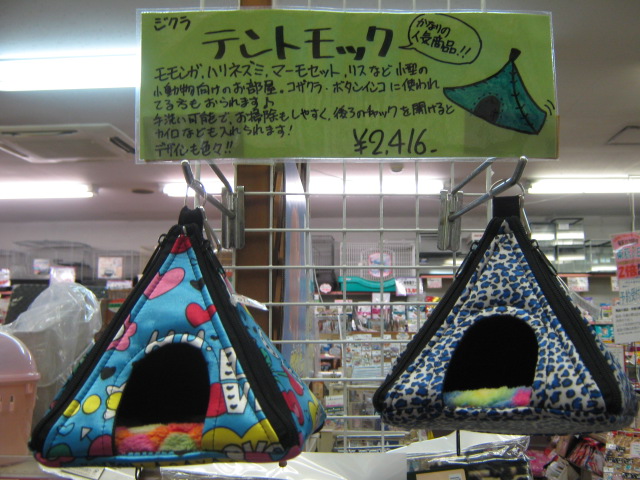 例えばコレ!この棚の一番上に並べてある「テントモック」! モモンガやリスさんをはじめ、様々な小型小動物に使えるハウスです。こうしてぶら下げることも出来ますし、後ろのチャックを開けると、底にカイロなども入れることが出来るようになっております。 か~なり人気の商品らしく、コザクラインコやボタンインコにお使いの方もおられるようです。デザインもホントに色々あって、楽しいハウスです