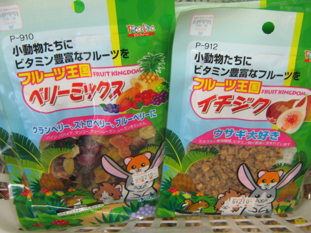 小動物おやつ、左側が「ベリーミックス」。色んなレーズンやベリーのミックスです。旨そうです。