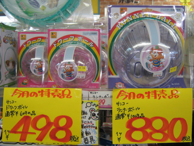 まずこちら!ハムちゃんを中に入れてコロコロお部屋の中をお散歩!小さなハムちゃん用の「ドワーフボール」と大きめハムちゃん用の「ランナーボール」。ご覧の特価!!で今月はやっております!