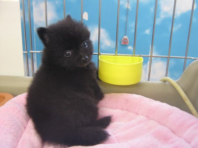 仔熊?いえいえ、ブラックのポメラニアンです!ピンクのベッドに乗っているけど、男の子!