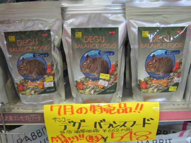 なかなかデグーのフードとかって特売にならないじゃないですか。だから今回特売に入れてみました。なるべくモルモットフードとかチンチラフードとかも特売にしていきたいと思っております。