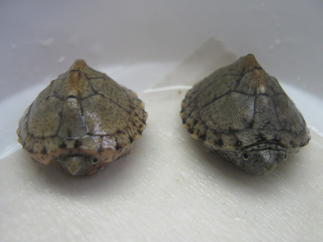 怖がって、手も足もみんな引っ込めちゃって、甲羅の中からチラッと上目遣いで見ている2匹は「カブトニオイガメ」。