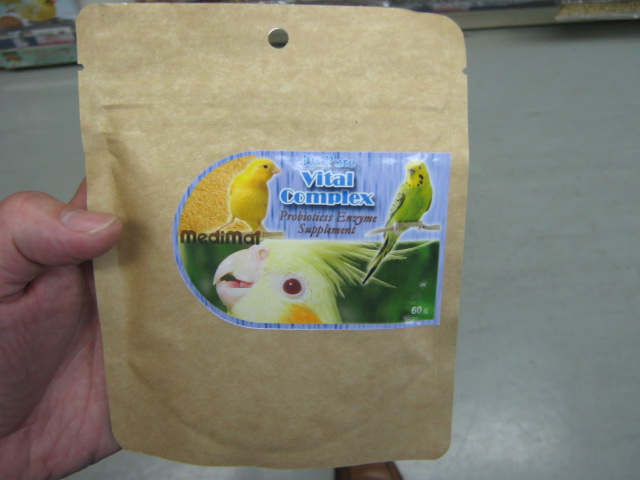非常に細かい粉末なので、新たにエサを買って来たらエサの袋を開封し、そこへこのバイタル・コンプレックスを1袋ザーッと入れてしまい、袋を閉じてシェイクしちゃうといいでしょう。そうすることで、バイタルコンプレックスをまぶしたエサを鳥さんに与えることが出来ます。