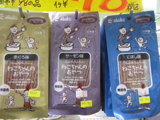 今や柏店のお客様で、ネコちゃんを飼ってらっしゃる方の2人~3人の内のお1人はコレを買ってらっしゃるのではないか?というほどの人気商品になっております「ねこちゃんのおやつ」。味は「まぐろ味」「サーモン味」「にぼし味」の3種類!一番人気は「まぐろ味」かな? どれでも特価!! ¥78!!