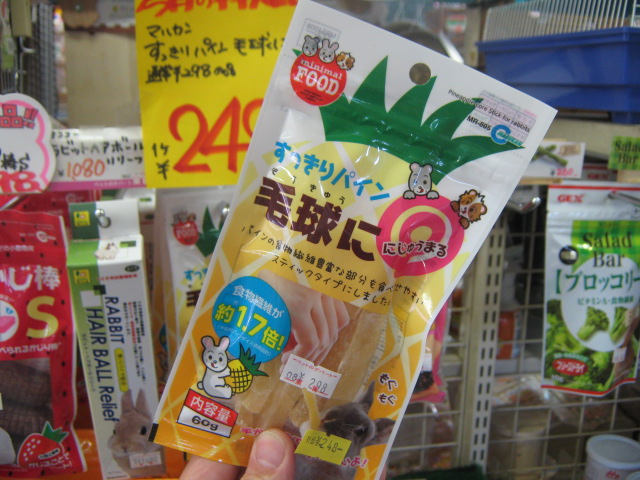 これ、私、なかなかいい商品だと思っています。 スティック状のパインって今まであまり無かったし、スティック状だから手に持って与えられるし! 特価!! ¥248!!