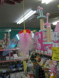 さっきのぶら下げるやつもそうですが、これらには透明のフィルムみたいな羽が付いております。この羽の動きと音がネコちゃんにはたまらないらしいんです!ピシャンピシャンっていう音。確かにウチの「しじみ」も大コーフンでした!