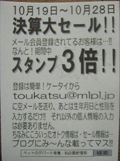 ★ 10月19日~10月28日 全店一斉「決算大セール」実施!! ペットが大サービス価格!! 特売品いっぱい! メール会員登録して頂いてる方は期間中なんと!スタンプ3倍押印!!