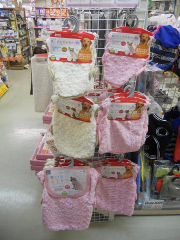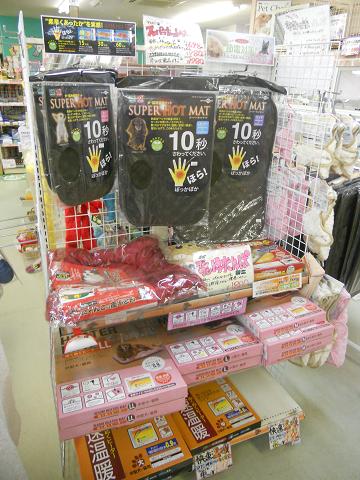 こちらがワンちゃんネコちゃん用の保温用品の棚。パネルヒーターを中心に他にも色んな物がございます。