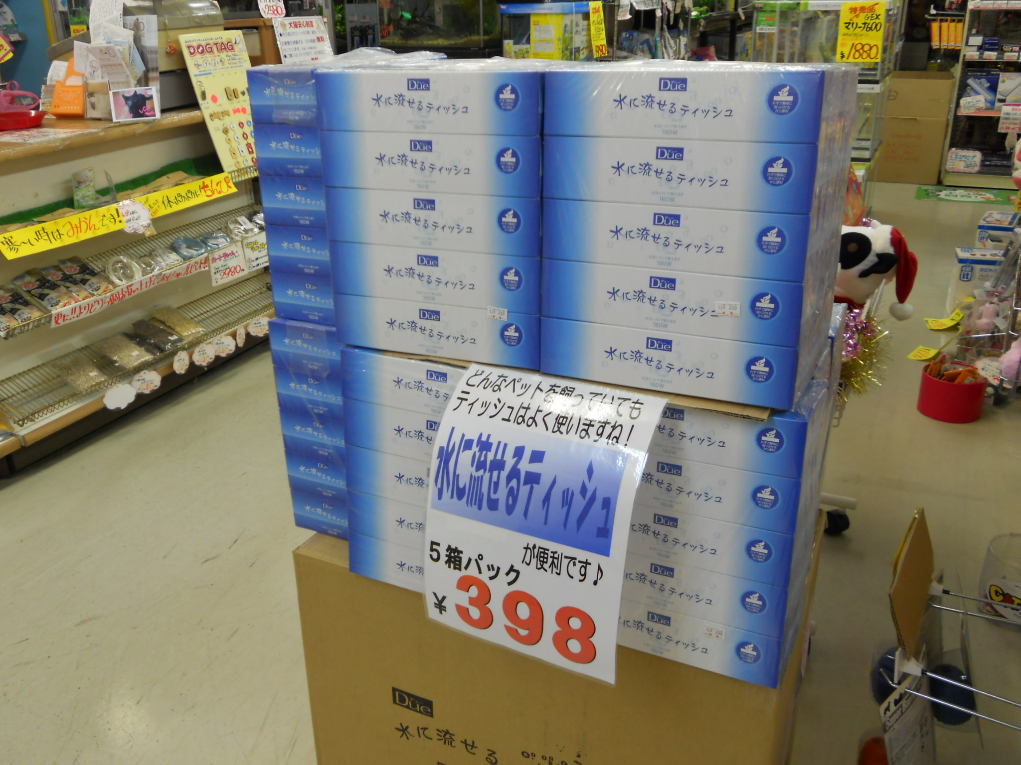 5箱パックで¥398! いかがです?ペットに使うだけなら5箱あれば結構もつんじゃないですか? 是非一度お試しを。 私、ちょっと使ってみたんですけど、水に流せる割には結構丈夫なティッシュでしたよ!