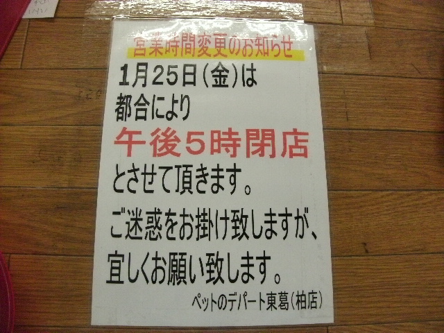 1月25日(金)の閉店時間なんですが都合により5時までとさせていただきます。誠に、ご迷惑をお掛けいたしますがどうぞ宜しくお願い致します。